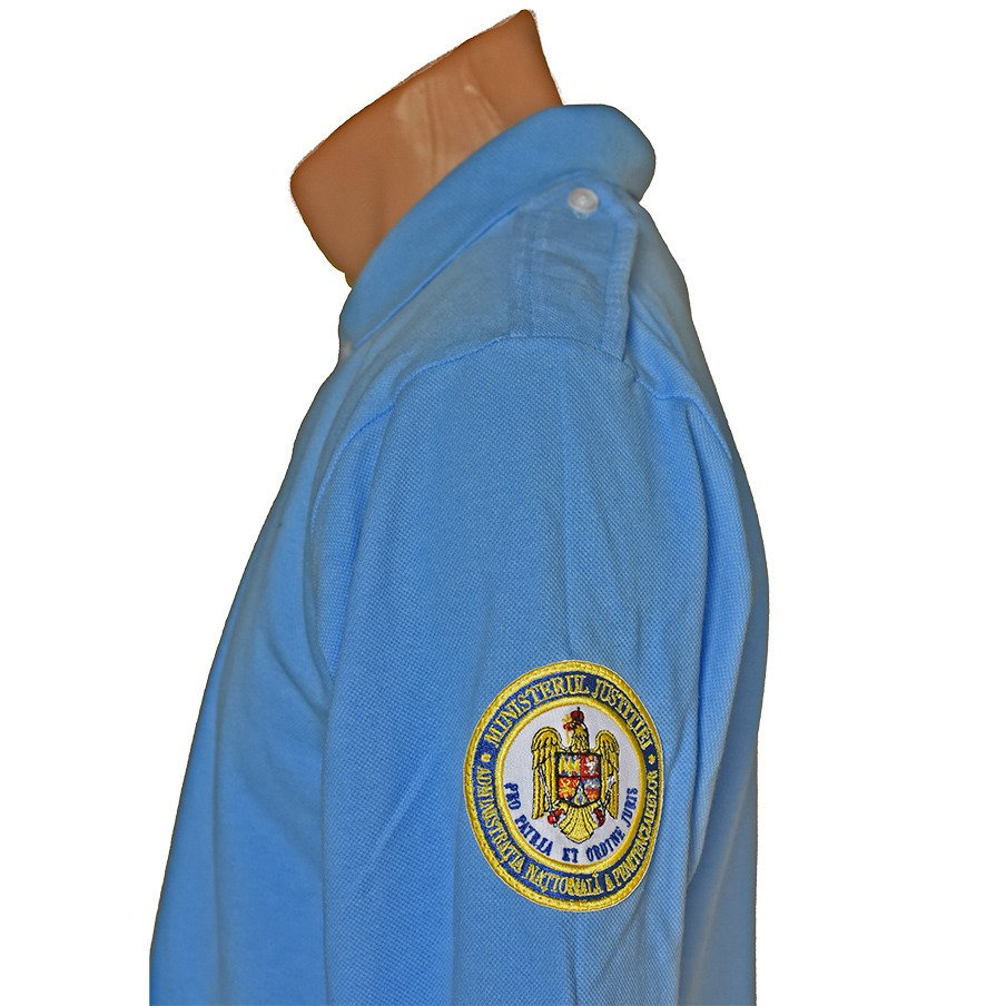 Piquet short sleeve knit shirt, light blue, 100% cotton composition.