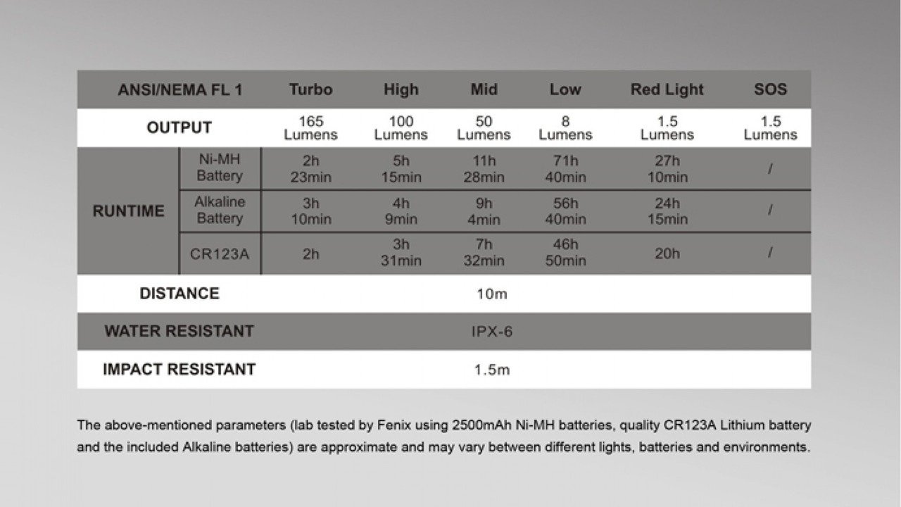 Battery type: | 1 * 3V CR123A or 2 * 1.5V AA (Ni-MH, Alkaline) |