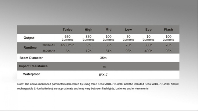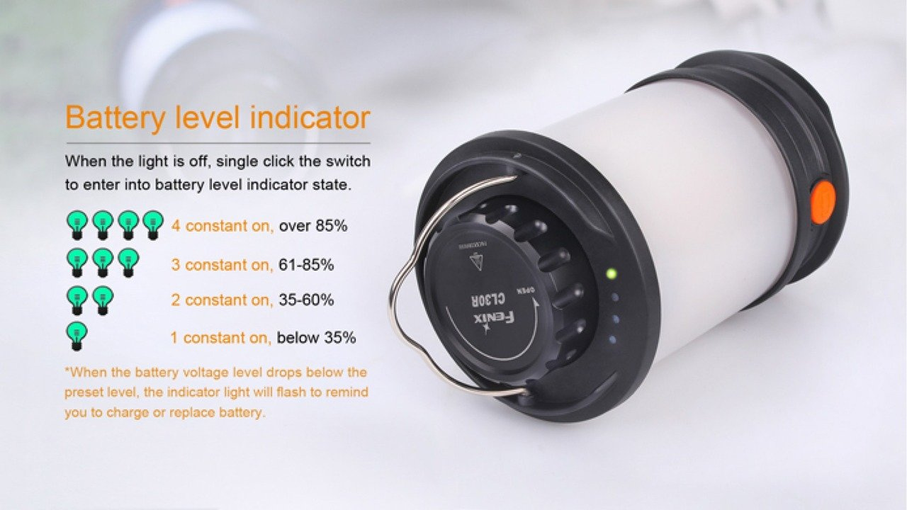The Fenix CL30R rechargeable camping lantern offers flexibility in power, charging and brightness levels. This versatile lantern not only features a Micro USB port to recharging, but it is the first Fenix lantern that serves as an independent charging station for other devices. The powerful CL30R delivers a maximum output of 650 lumens, which illuminates an area 35 meters in diameter. Powered by one, two or three 18650 rechargeable batteries, this lantern offers five brightness levels, Turbo and Flash. The CL30R features a cold-resistant battery compartment for all-season use, charging and battery-level indicators for accurate operation, and a hanging lanyard and tripod socket for flexible lighting options.