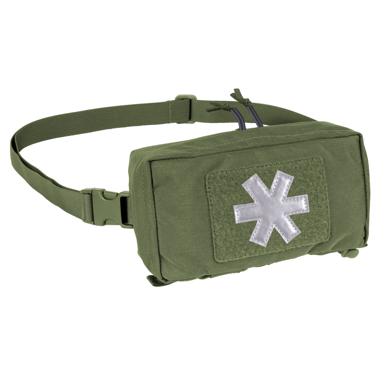 The pouch is accessed via a two-way zipper. Inside there is a velcro panel for mounting the Med Insert, two elastic ribbon loops, two Paracord loops, and a mesh pocket with an elastic drawstring. The pouch is available in several colors, has a velcro panel with a reflective paramedic cross embroidered, a detachable hip belt, and in the bottom part, three ribbons and an elastic drawstring. It is MOLLE/PALS-compatible.