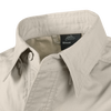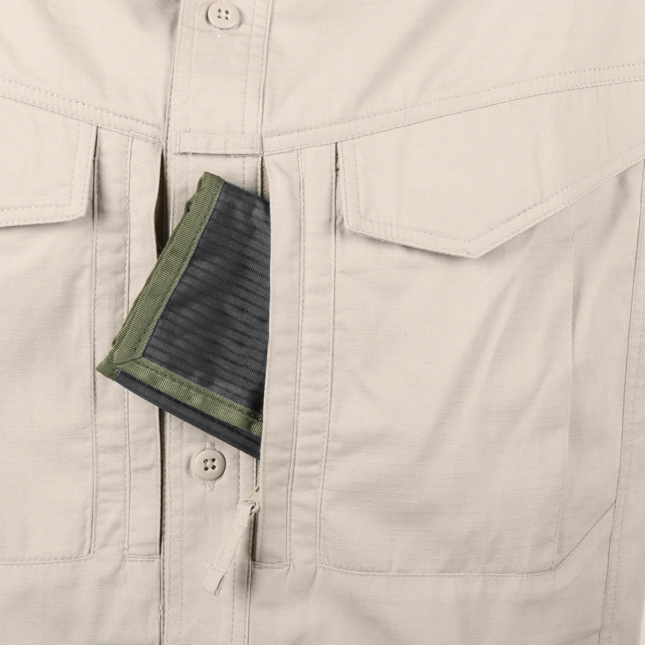 This shirt is designed for law officers, operators, security personnel, and active persons who need garments combining functionality, tactical look, and esthetics. It is cut loose enough to allow movement, hide a low-profile body armor or IWB holster. The fabric is breathable and dries quickly. Front stiffener under the collar prevents collar rolling – it would stay neat even under duress. The button slat has an eyeshade holder.