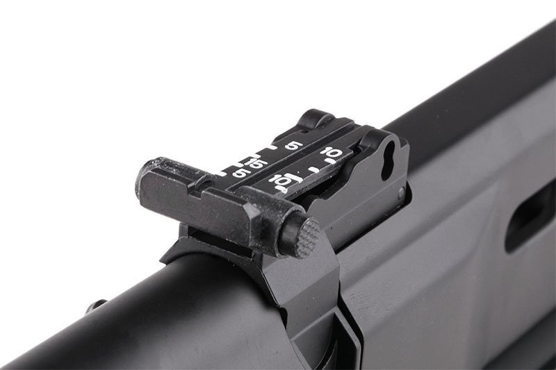 High-quality polymer elements: model-specific cylindrical magazine and pistol grip.