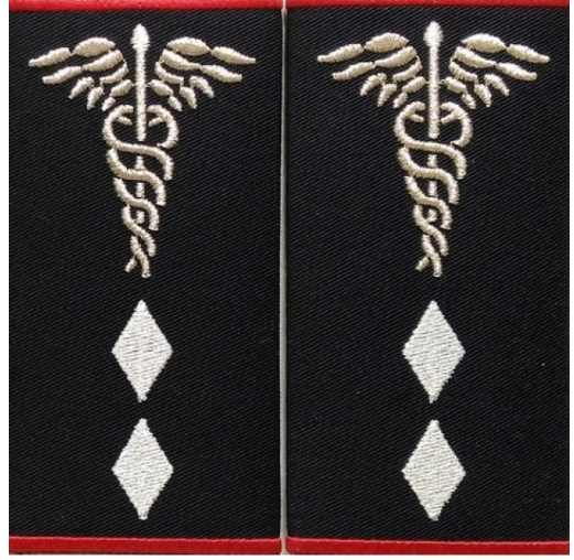 Grade Paramedic Debutant ambulanță tip manșon, tubulare, brodate cu fir Madeira Polyneon, 100% poliester, de culoare roșie și metalică argintie. Conturul exterior este roșu. Întreaga broderie este aplicată pe un material de suport cu întăritură termocolantă din țesătură 65/35% bumbac/poliester. Culoarea suportului este navy și realizează un contrast perfect cu firele folosite la broderie. Datorită utilizării materialelor de cea mai înaltă calitate, gradele pot fi utilizate în exterior, fiind extrem de rezistente la vânt, ploaie, raze solare, precum și la spălări multiple.