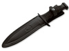 Zamak handle with coating of plastic elastomer, blade made of stainless chrome steel (I-42). Sheath made of black laminated leather.