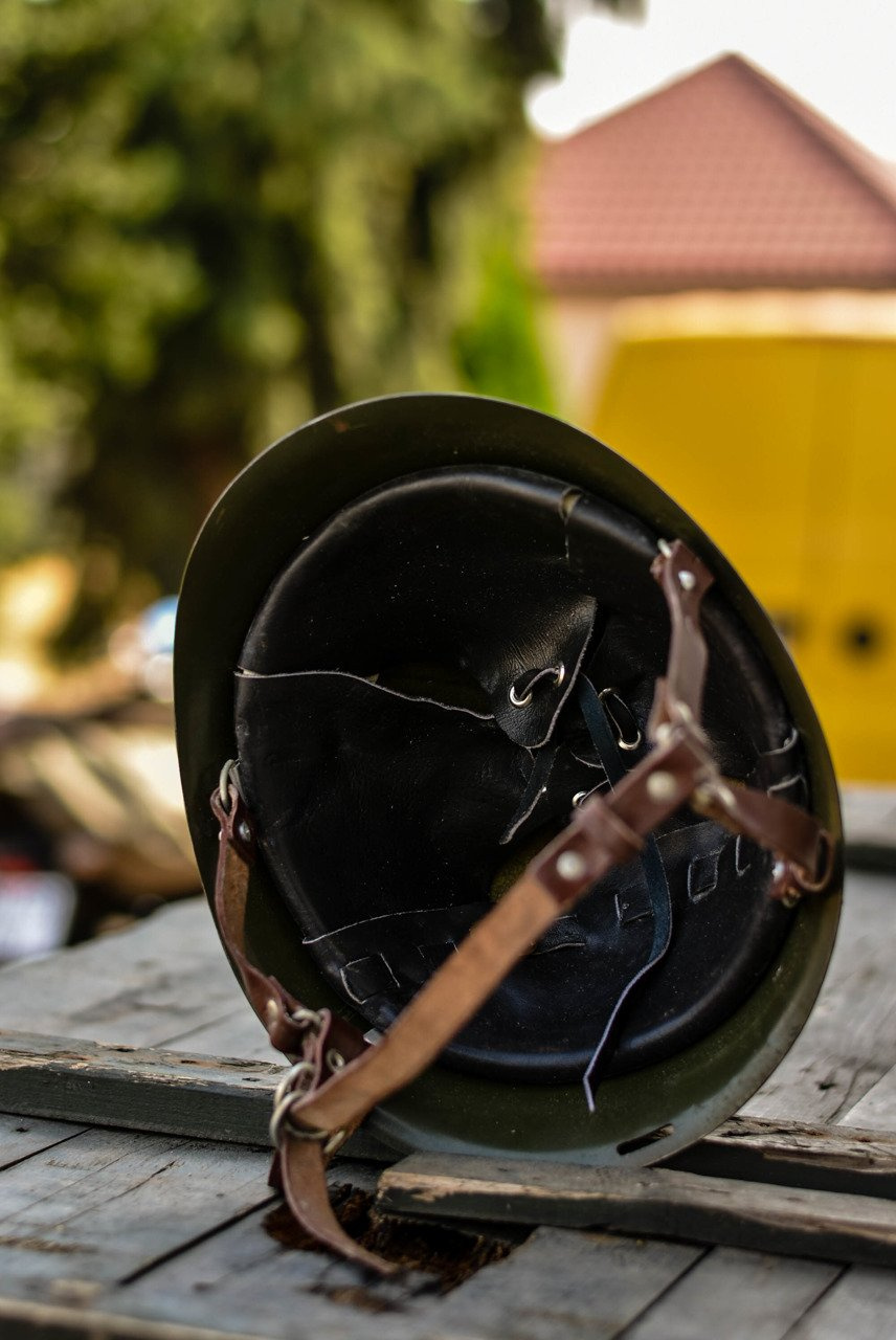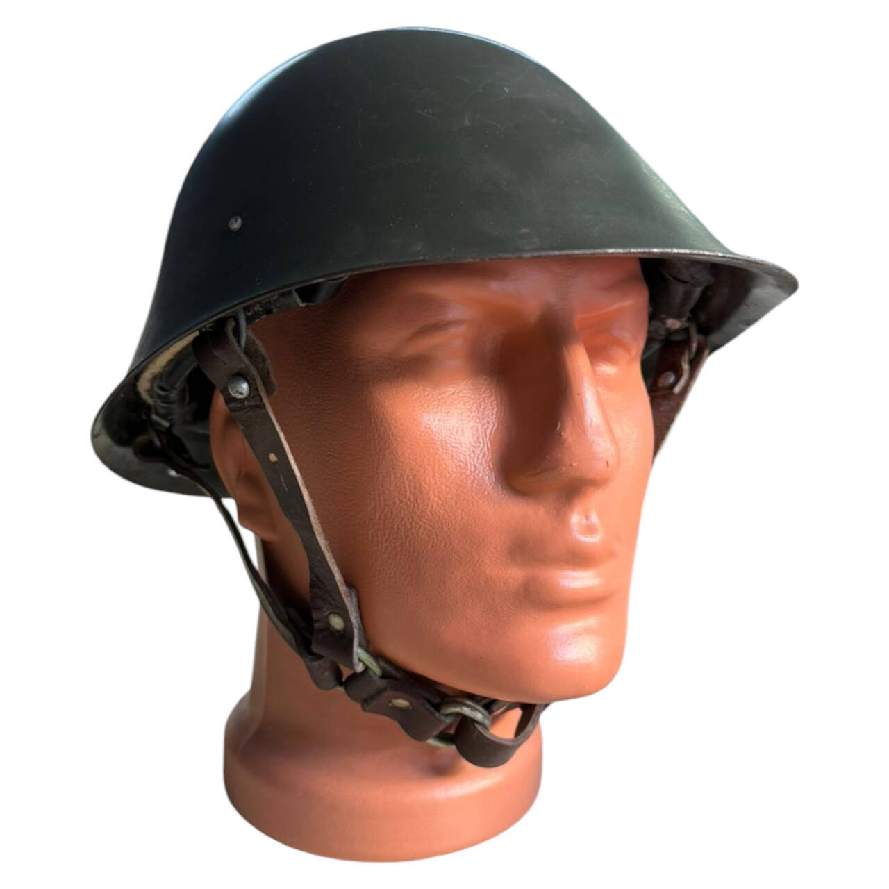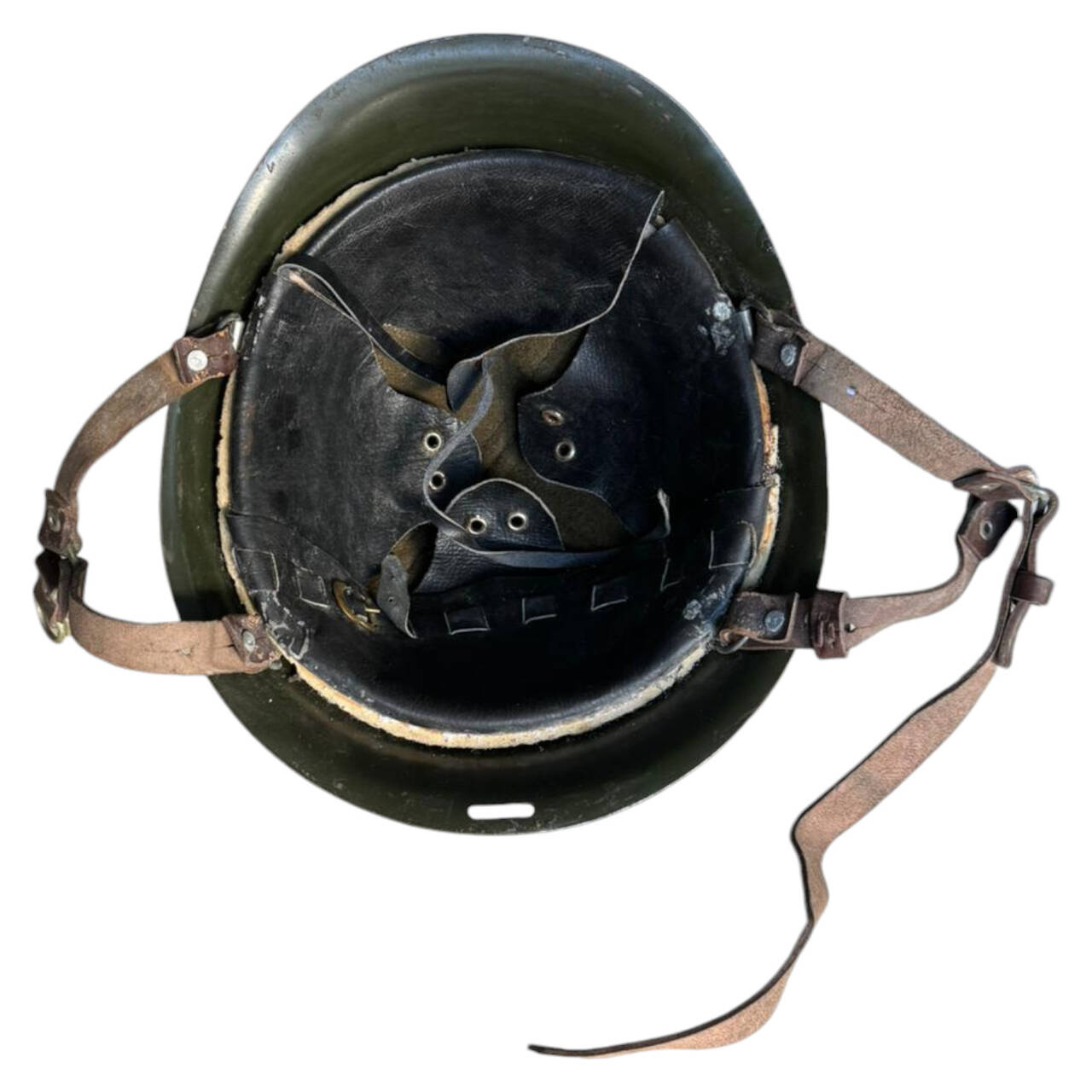 Romanian Miltary Steel Helmet. Introduced in Romanian Army use beginning with 1973, it gradually replaced model M38 and model M38/42 used by the Romanian Army in WWII and the Soviet M40 helmets, used after WWII. Its shape is inspired by the M38 model that it replaced (which was a descendant of the Dutch M34 helmet). Model M73 was manufactured from superior quality steel with good ballistic protection properties. The quality of the steel was enhanced by the peculiar shape which offers inclined slopes all aorund the helmet. The interior lining is made out of leather, with added padding made of horse hair or felt inside. The chin strap has four connection points and it is doubled uder the chin. In the back of the head it has a leather flap that can be adjusted to fit the head. In the back it has a slot for fixing on the haversack. The year of manufacture and serial number can be found under the leather lining. Romanian Military Surplus.