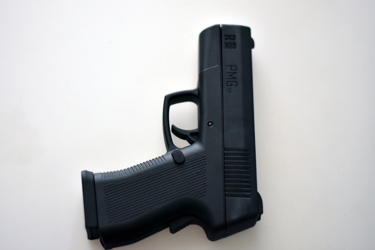 The gun is made of a durable polymer having a matt, non-slip texture. PMG-37 is very handy , also has low weight (400 grams), allowing you to comfortably carry it with you every day, by both men and women. Solid gun very well imitates guns , also has movable / functional elements, ie. An adjustable fuse, release the magazine and pulled the magazine.