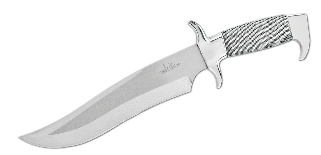 New edition of a classic knife designed by Gil Hibben in the United Cutlery range. This masterpiece features a mirror polished 420 stainless steel blade. The metal fittings, guard and head are made of stainless steel. Each Highland Bowie knife is accompanied by a genuine leather sheath with snap closure. These select pieces are available for a short time only.