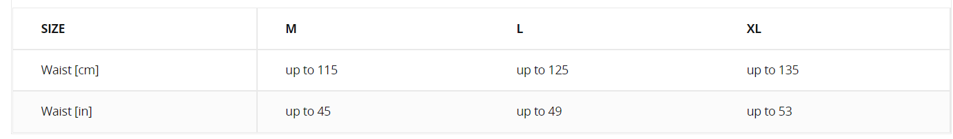 - length: size M fits waist circumference up to 115 cm, size L - up to 125 cm, size XL up to 135 cm