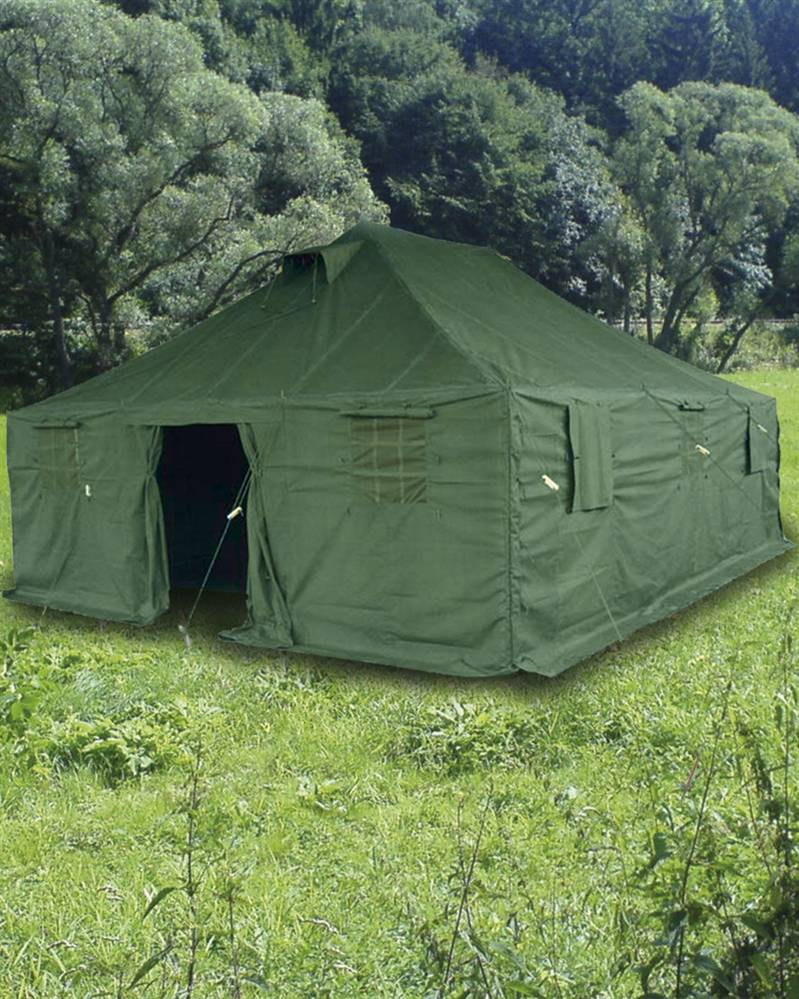 The army tent in olive is a robust, rectangular tent and has a floor made out of polyethylene. There is space for up to 15 people in this large tent, and the windows can be closed with roller blinds. A team tent - for those who are outside a lot and still want spacious accommodation. Classically proven and unsurpassed. Fits wonderfully into any environment and is very stable and steadfast. The windows provide pleasant light inside the tent. Compact construction suitable for summer and winter. Easy assembly. The tent has a rectangular base area of 30m², ridge height: 3.2 m, side height: 1.75 m. 2 central posts at a distance of 2 m, 2 skylights, 2 entrances, 10 side windows with cover. All pages can be rolled up individually.