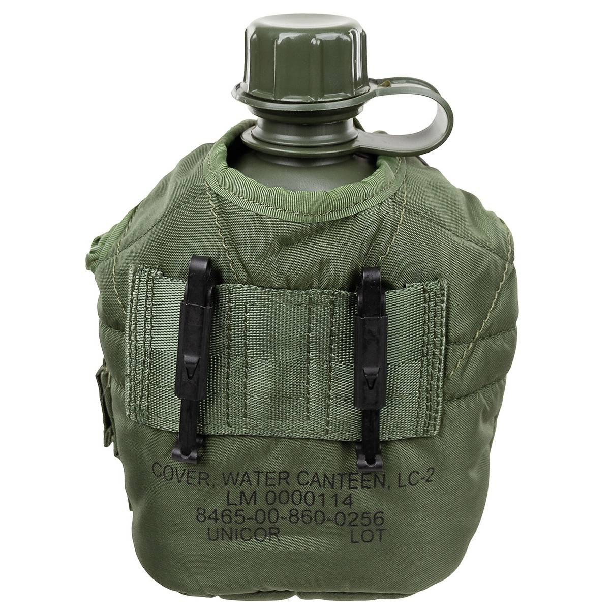 Original worn (used) US Army worn nylon military pouch with side pocket and two buckles for attaching to belt or backpack. The plastic bottle is new - unused.