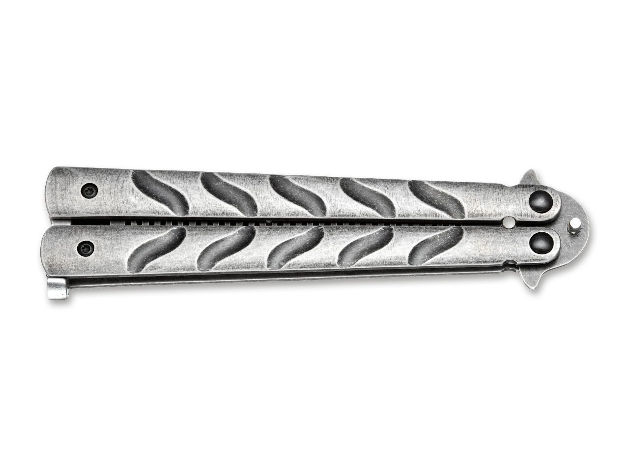 The Asian balisong has an unmistakable presence even in the shape of a comb. The comb and the bisected handle are made of stainless steel with a dark stonewash finish. This turns combing a straight part almost into a tactical task.