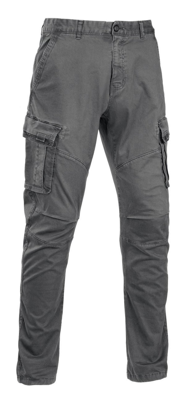 Cargo pants with 2 front pockets with reinforced edges, 2 large side pockets and 2 backpockets with button fastening.