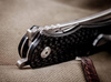 The D2 blade has a fine lengthwise satinized finish with decorative filework on the spine that also serves as a thumb rest. It rests on ball bearings and opens with the front flipper that is typical for the Japanese knifemaker's designs. The blade is secured with a sturdy linerlock. The slightly contoured handle scales are made from carbon fiber mounted on solid stainless liners. The full-length spacer also consists of stainless steel, creating an elegant contrast to the dark scales. A black leather lanyard and 3D CNC-milled clip complete the design.