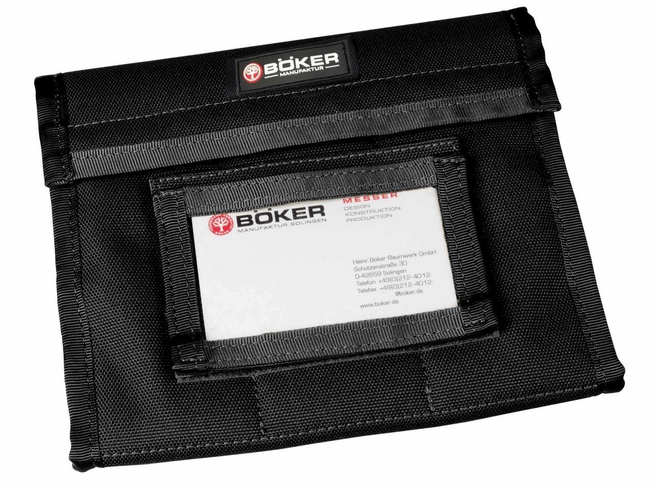 Revised version, changes include an even higher quality lining for careful storage with 3D Rubber logo. Finally a Boker knife pocket that offers the collector safe and proper storage and transport for his valuable folding knife collection. The pockets offer individual compartments that are completely separate from one another so that the blades do not come into contact with each other even when it is full, preventing them from being scratched. A soft inner lining prevents chafing, etc. The outer compartments are kept extra wide to accommodate large folders without problems. With Velcro strap and removable Velcro holder for business cards or notepad. Velcro surface can also be used for patches. Black. For 6 knives.