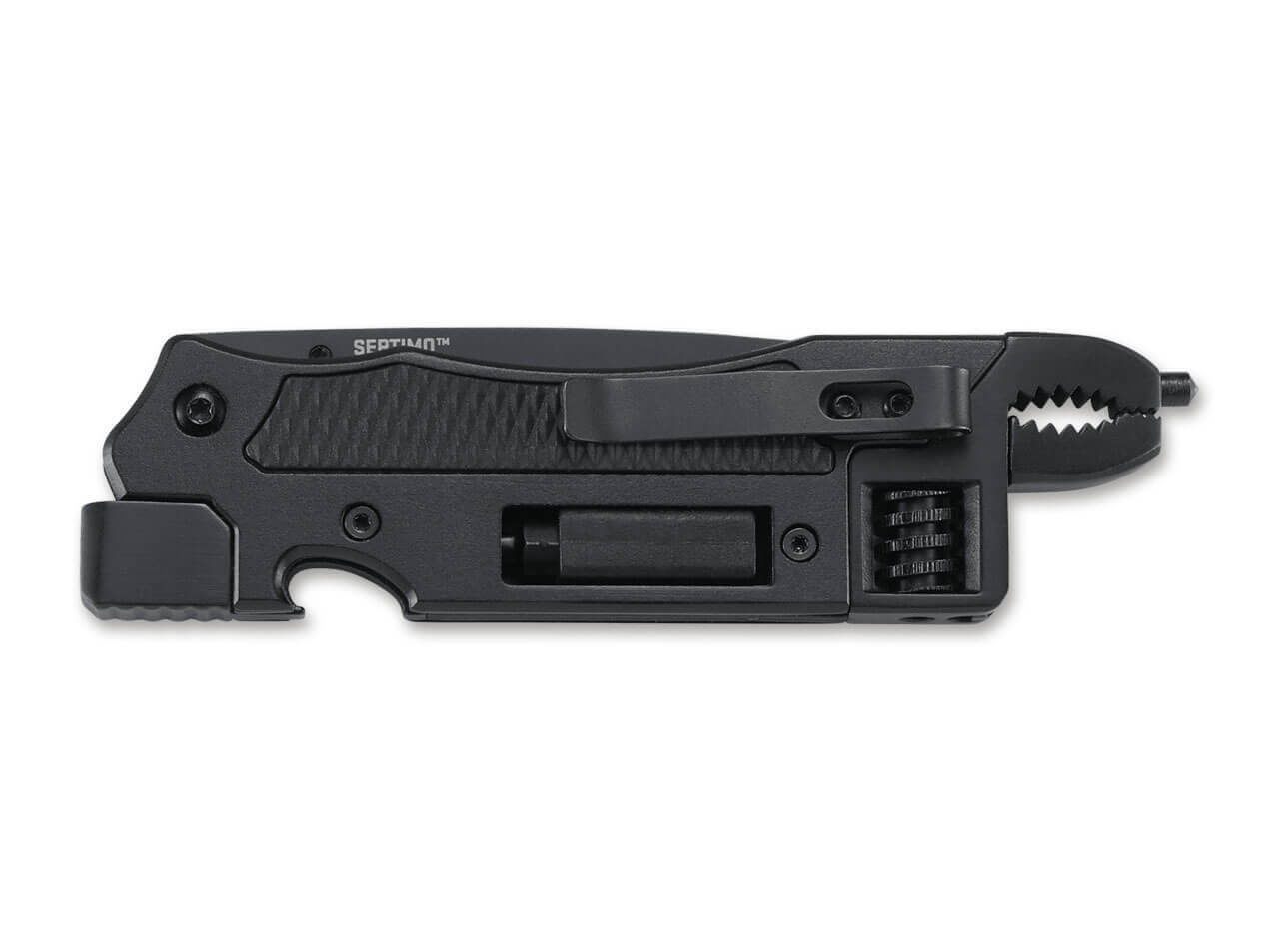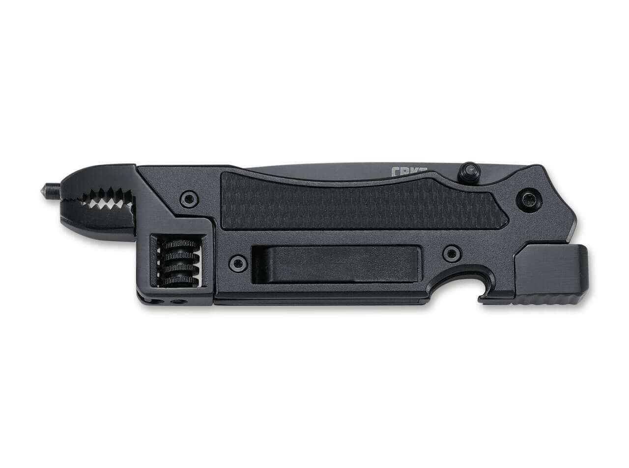 For all those who have to take their important belongings with them, CRKT now has a compact solution. The Septimo Multitool All Black comes up with 7 great functions for all skilled manual situations. The tanto blade made of 8Cr13MoV convinces with a high edge retention and has an integrated belt cutter. The knife is opened with a thumb stud, while the sturdy linerlock secures the blade perfectly even in difficult work situations. In addition, the mini tool convinces with a slotted screwdriver, a Philips crosshead screwdriver, a bottle opener, a glass breaker and adjustable pliers at the end of the handle.
