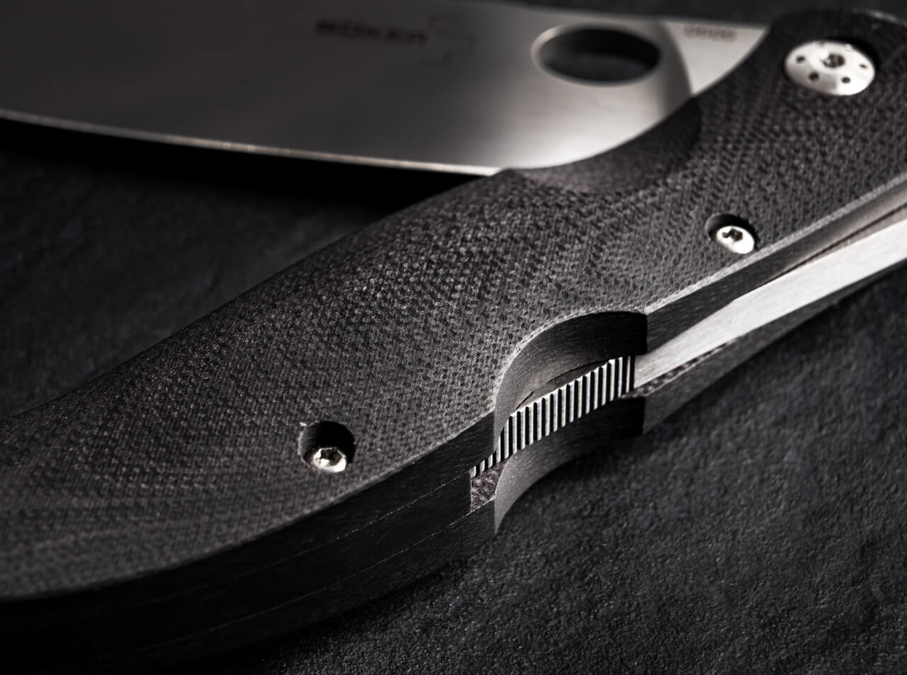 The lightweight pocket knife but very sturdy Boker Plus Yukon is perfect as an easy-to-use everyday knife or compact hunting and outdoor knife. The almost convex blade of 440C is secured with a new patented backlock based on a space-saving wire bracket. The lock doesn't need a top spring so that the blade has significantly more room in the handle. It has a fine hairline finish and locks with an extremely sonorous clicking sound. The black handle scales are made from lightweight G10. With their textured surface and ergonomic shape, the knife offers a secure grip even in bad weather. The ridged thumb rest and hidden lanyard hole finish the design. No clip.