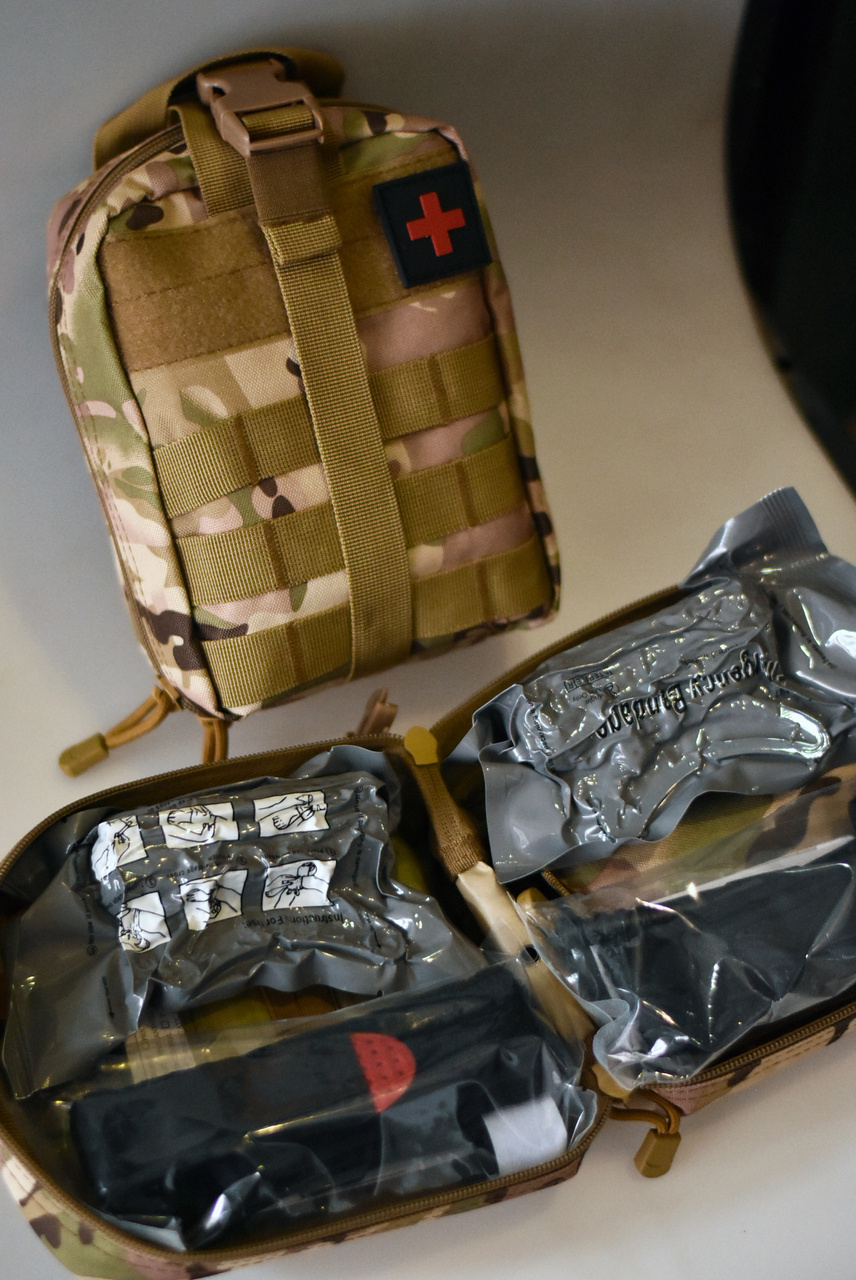 - practical first aid kit with first aid supplies included, ideal for outdoor sports such as camping or trekking, military tactical training, paintballing, etc.