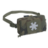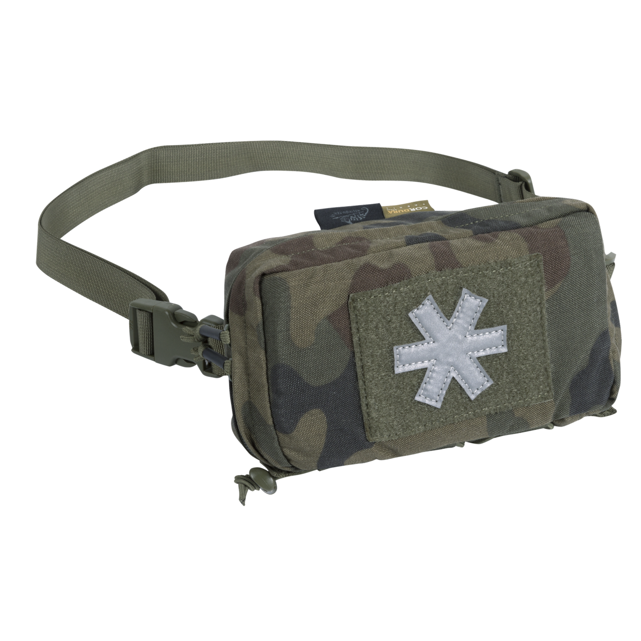 The pouch is accessed via a two-way zipper. Inside there is a velcro panel for mounting the Med Insert, two elastic ribbon loops, two Paracord loops, and a mesh pocket with an elastic drawstring. The pouch is available in several colors, has a velcro panel with a reflective paramedic cross embroidered, a detachable hip belt, and in the bottom part, three ribbons and an elastic drawstring. It is MOLLE/PALS-compatible.