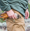 Pilgrim are highly durable and lightweight pants made of DuraCanvas® fabric. The pants have slightly risen back to protect your kidneys against cold. Additionally, this part is padded with thin foam to provide even more comfort during use. The pants have eight pockets total. Large, buttoned cargo pockets on thighs have internal mesh panels to provide additional ventilation when pockets are open. Classic hip pockets have reinforcements on edges to protect them from being damaged quickly by knife clips. Between cargo and hip pockets there are smaller zippered pockets. On the back, there are small buttoned pockets with reinforced edges. Waist and leg cuffs are adjustable. The pants have minimalistic loops for suspenders. Wide belt loops will fit up to 40mm belts, while additional loops on the front allow dummy cording. Additional visual features are the Helikon-Tex® branded buttons. To provide better protection against small rain, the fabric can be impregnated with special wax.