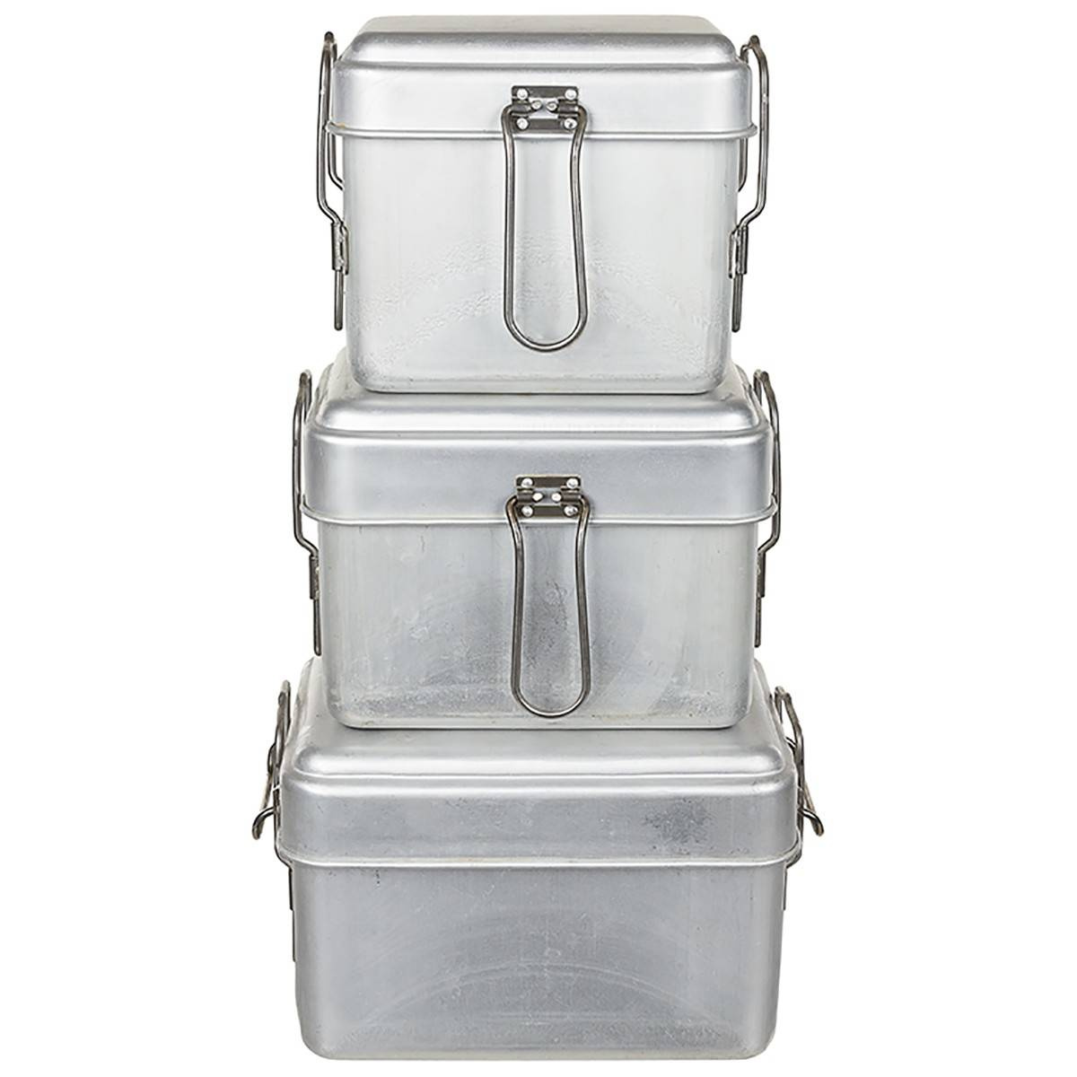 There are plenty of cooking vessels nested tightly together including three aluminum cook pans and three aluminum cooking pots.