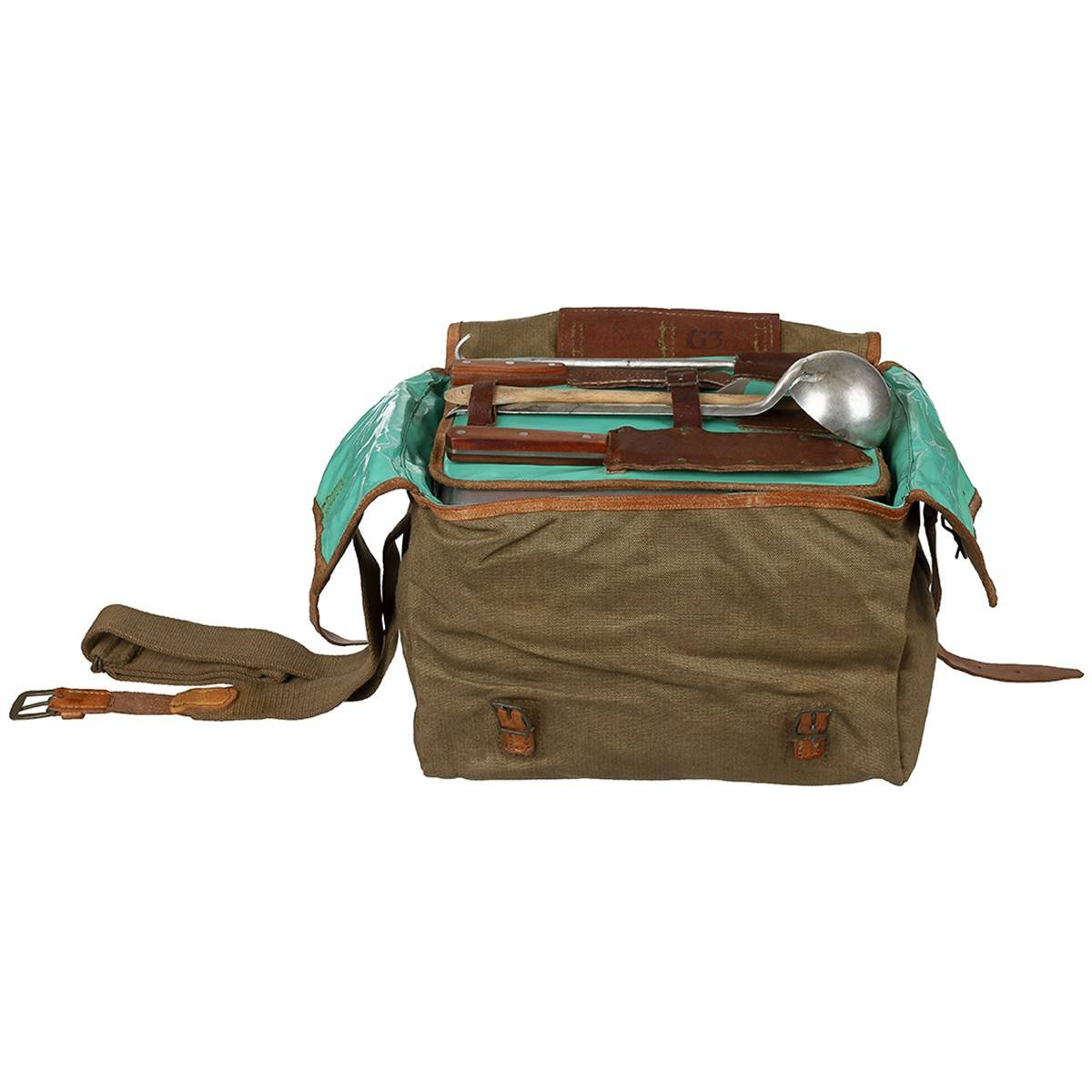 This vintage field kitchen comes with everything a camp cook needs to make a hot meal for the troop. Everything a camp chef needs is packed tightly into this old-fashioned compact canvas carry bag.