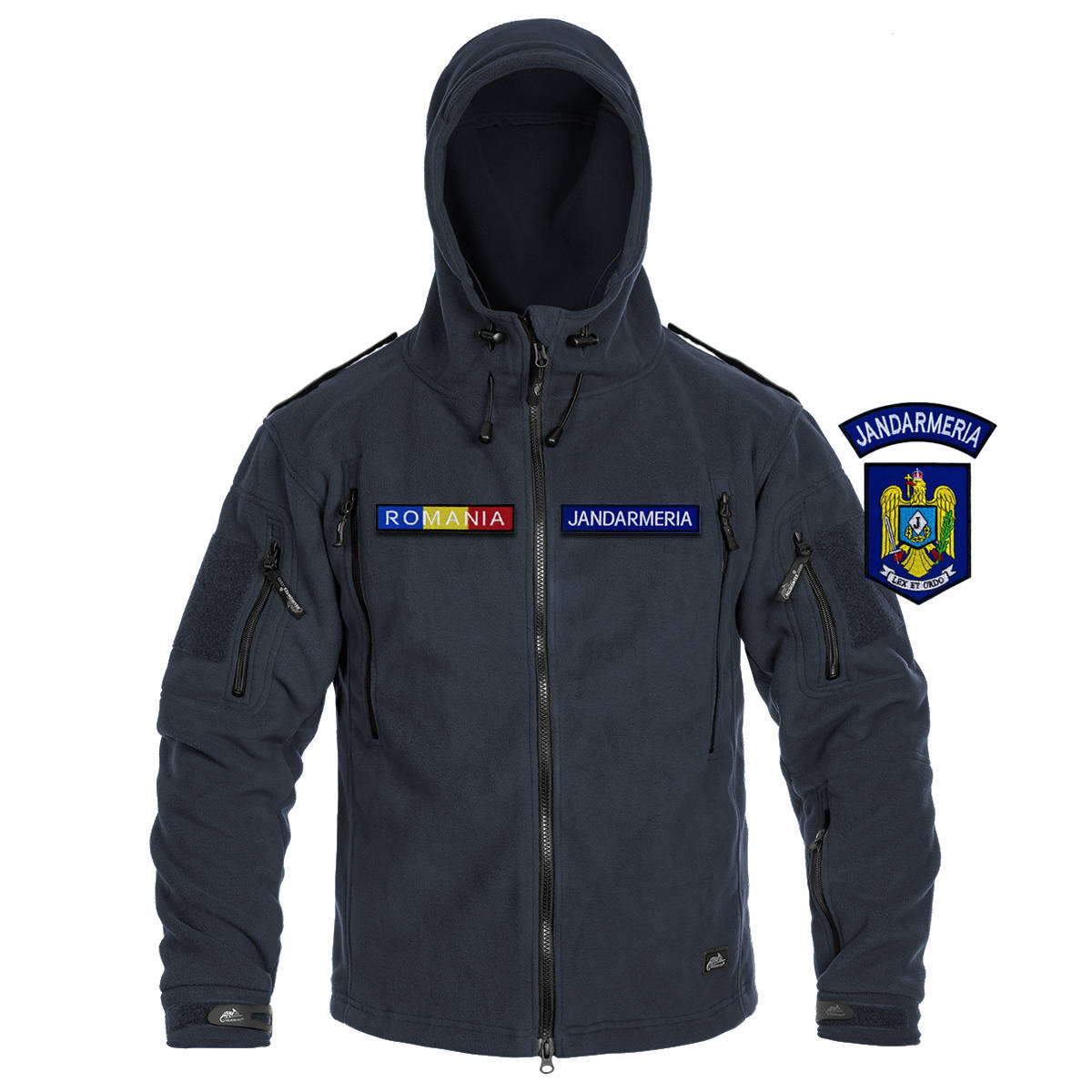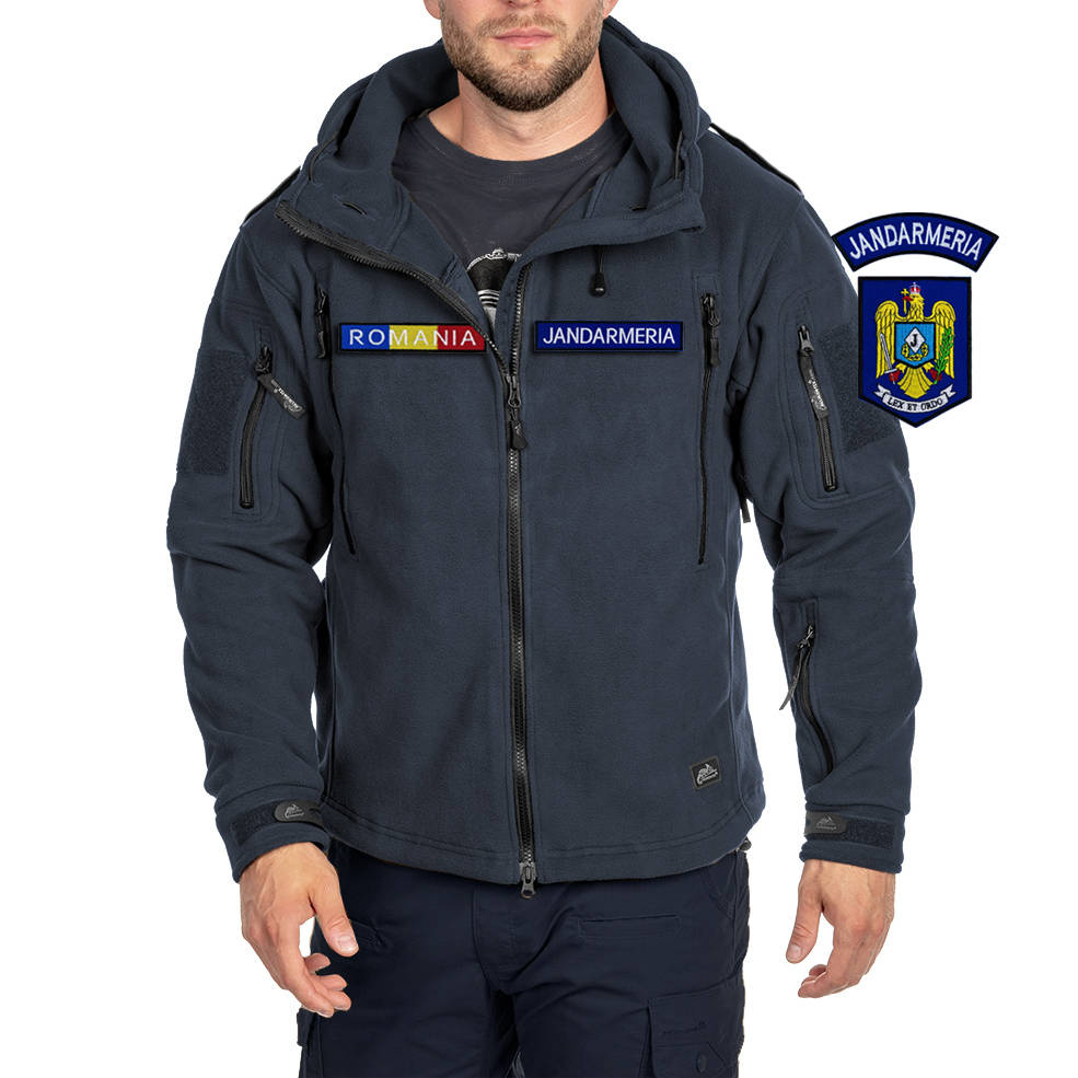 Patriot Heavy Fleece jacket is the most advanced of other Helikon Tex®  fleece jackets offer and it is personalized with Velcro embroidered emblems for Romanian Jandarmery. It is designed for tactical use in extreme weather. The jacket features an adjustable, small-visored hood, for additional protection, as well as a set of pockets for tactical essentials. Breast pockets have wiring eyelets and small device organizers. Three external pockets in easily reachable areas – on either upper or left lower sleeve – would allow additional storage. Elbows are reinforced for additional wear and tear resistance. The jacket can be individually adjusted by Velcro-adjustable cuffs and elastic drawstrings in the hood and jacket bottom. Patriot is a versatile and durable upper apparel suitable for cold climes.