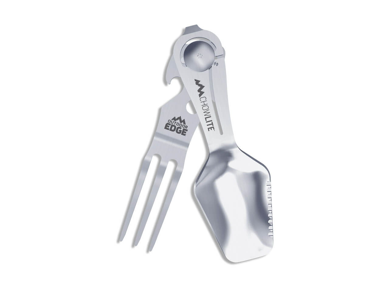 Outdoor Edge's compact Chowlite is made of lightweight stainless steel for easy storage. The folding design unfolds and locks securely, and consists of a full-sized fork and serrated spoon. In addition, the camping cutlery features a built-in bottle opener, can opener, and screwdriver tip. Made of 420J2 stainless steel.