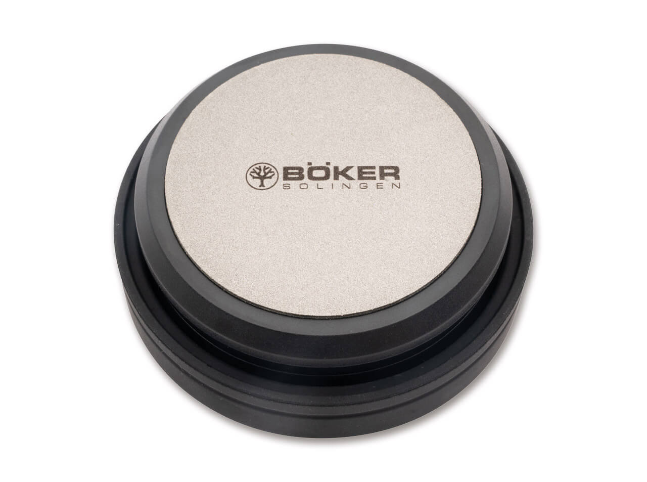 The sharpening puck is a compact and easy-to-use sharpening device that is used primarily for larger knives and garden tools such as axes, machetes, spades, and hoes. The grinding surface is simply moved in a circle over the cutting edge. These abrasive pucks each have two sides in different grit sizes. The silica gel shells, which hold the pucks snugly, are used for storage and transport. As a single half, they can be used as a non-slip handle during the sanding process. We offer two differently configured pucks. This puck carries a 360-grit abrasive surface coated with industrial diamond on one plastic core and an abrasive surface made of a technical ceramic with maximum fineness on the other. Both sides are suitable for wet and dry grinding. The diameter of the two grinding surfaces is 6 cm each.