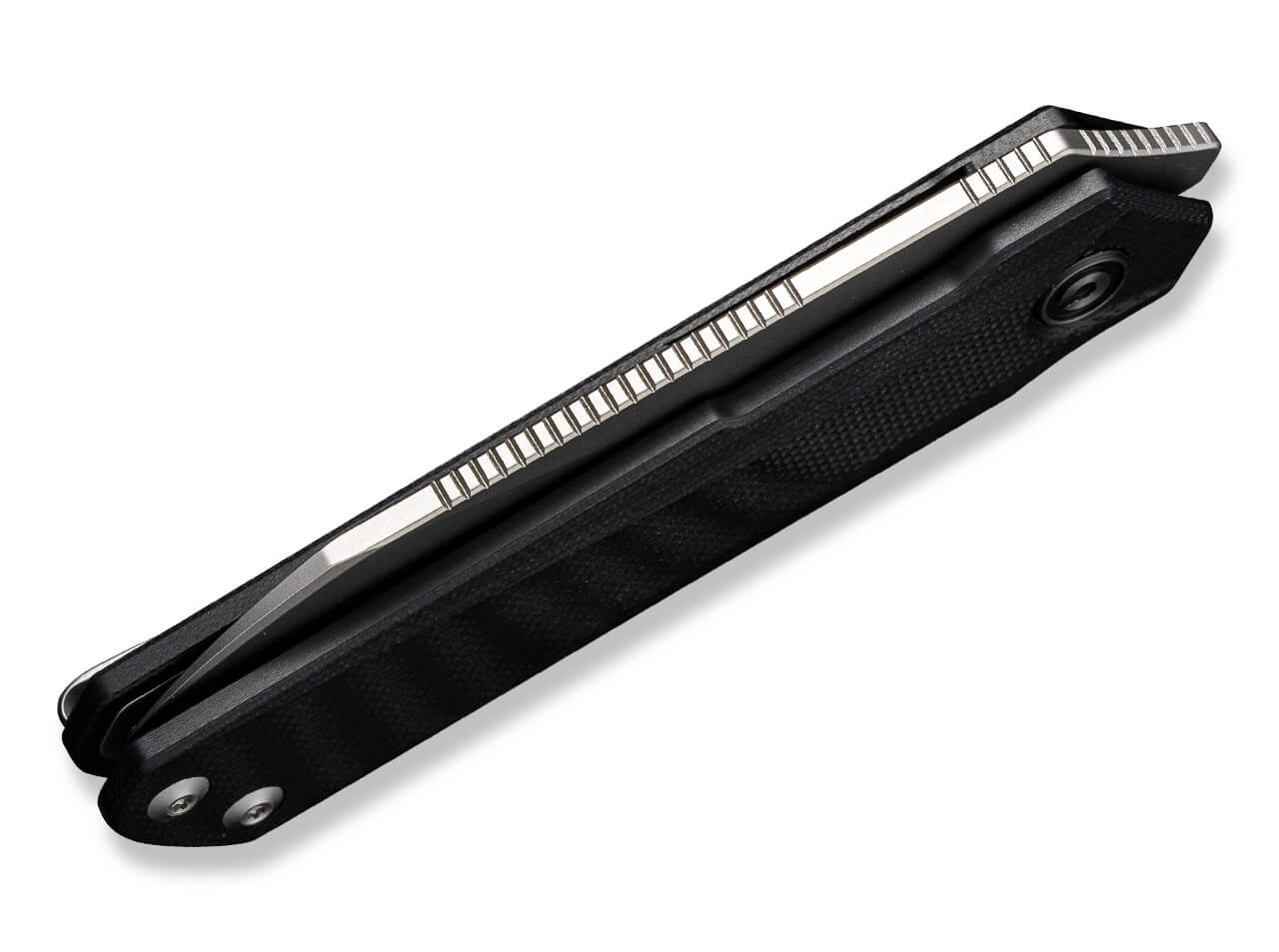 The full-grown version of the popular Ki-V by designer Ostap Hel convinces you with a black Nitro-V blade for even more suitability for everyday use. The flipper opens the knife as fast as an arrow, while the liner lock reliably secures the blade. Grooves on the back of the blade provide additional grip. The black G10 handle fits snugly in the hand and is equipped with a tip-up clip (r).