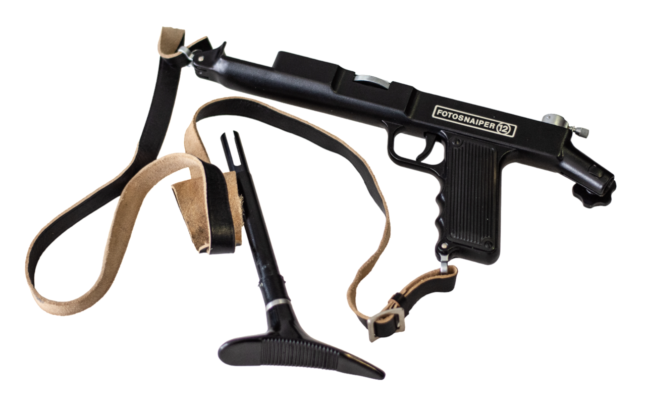 The Photosniper SLR-"gun" was made first by GOI and later by KMZ, originally for military use. Probably its original purpose was to use the quiet hands of good soldiers to shoot reconnaissance photos out of their emplacements. Later models were freely available as cameras for amateurs, nature photographers, spies, and paparazzi.