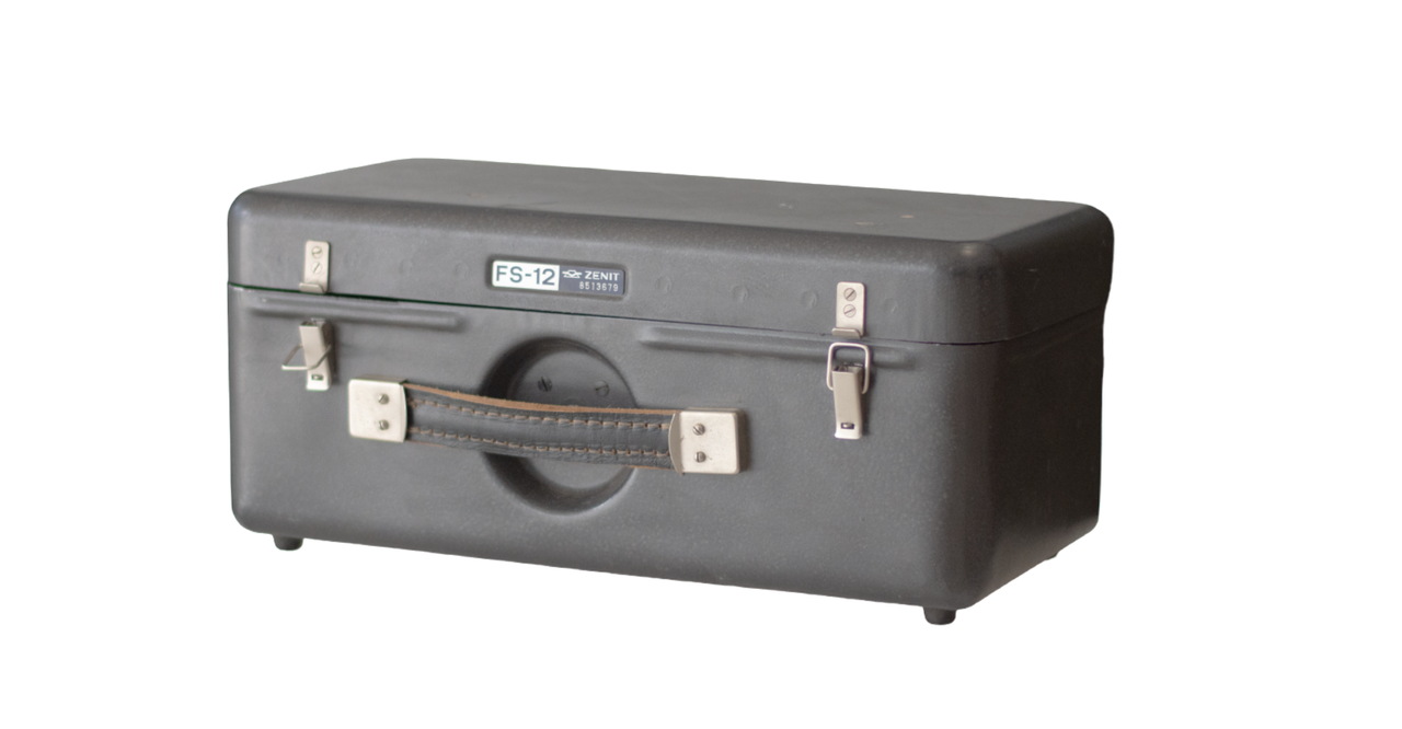 The FS-12 is a very similar kit to the FS-3, with updated components. The camera body is a Zenit 12S; this photo sniper, therefore, has a marked advantage over the FS-3 of through-the-lens metering. It was again supplied in an enameled steel suitcase, with the updated Helios 44 - a Helios-44M4 (or 44M5 or 44M6) 58 mm f/2 - and Tair-3AS 300 mm f/4.5 tele lens.