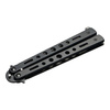 The Magnum Balisong All Black Pocket Knife consists of two scales of handles, which can be rotated 180 degrees. Between these two handles is the blade, which is secured with a spindle pin. The handles, like the blade, are in a tactile matte grey. This knife is a lightweight and versatile companion with a wide range of applications in everyday life.