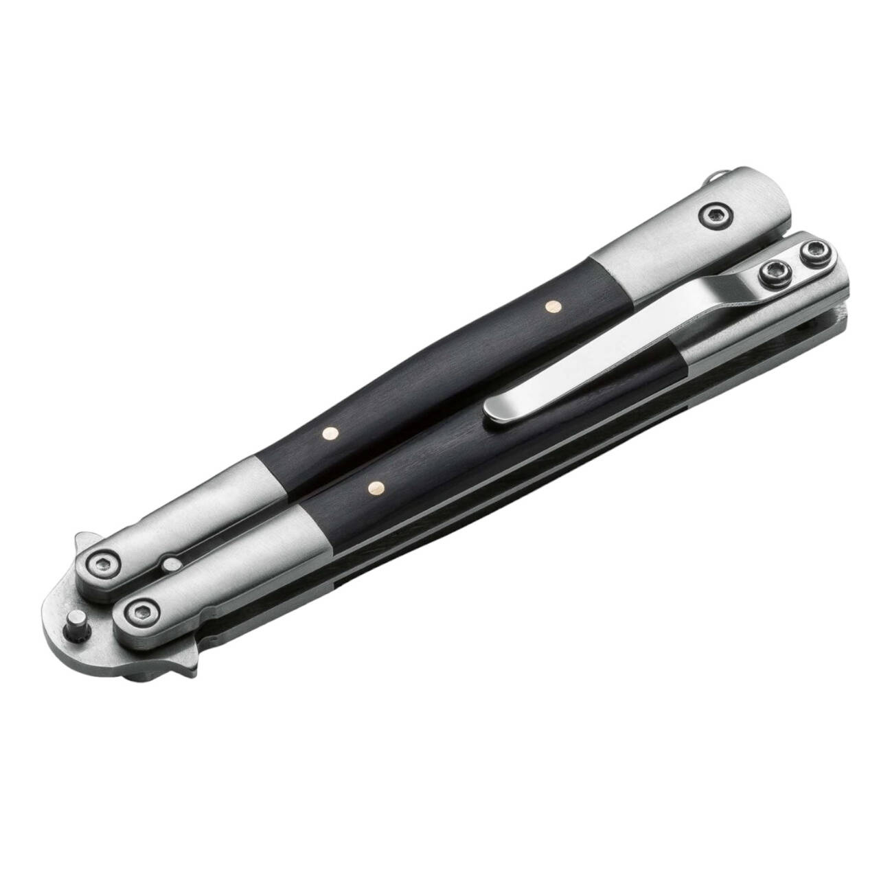 It comes with a classic combination of stainless steel and Pakka wood. The bolt-on construction offers high functionality and strength. The 440 stainless steel blade has a pleasing indentation. The pocket clip allows the Balisong to be worn comfortably and easily accessible in your pocket.