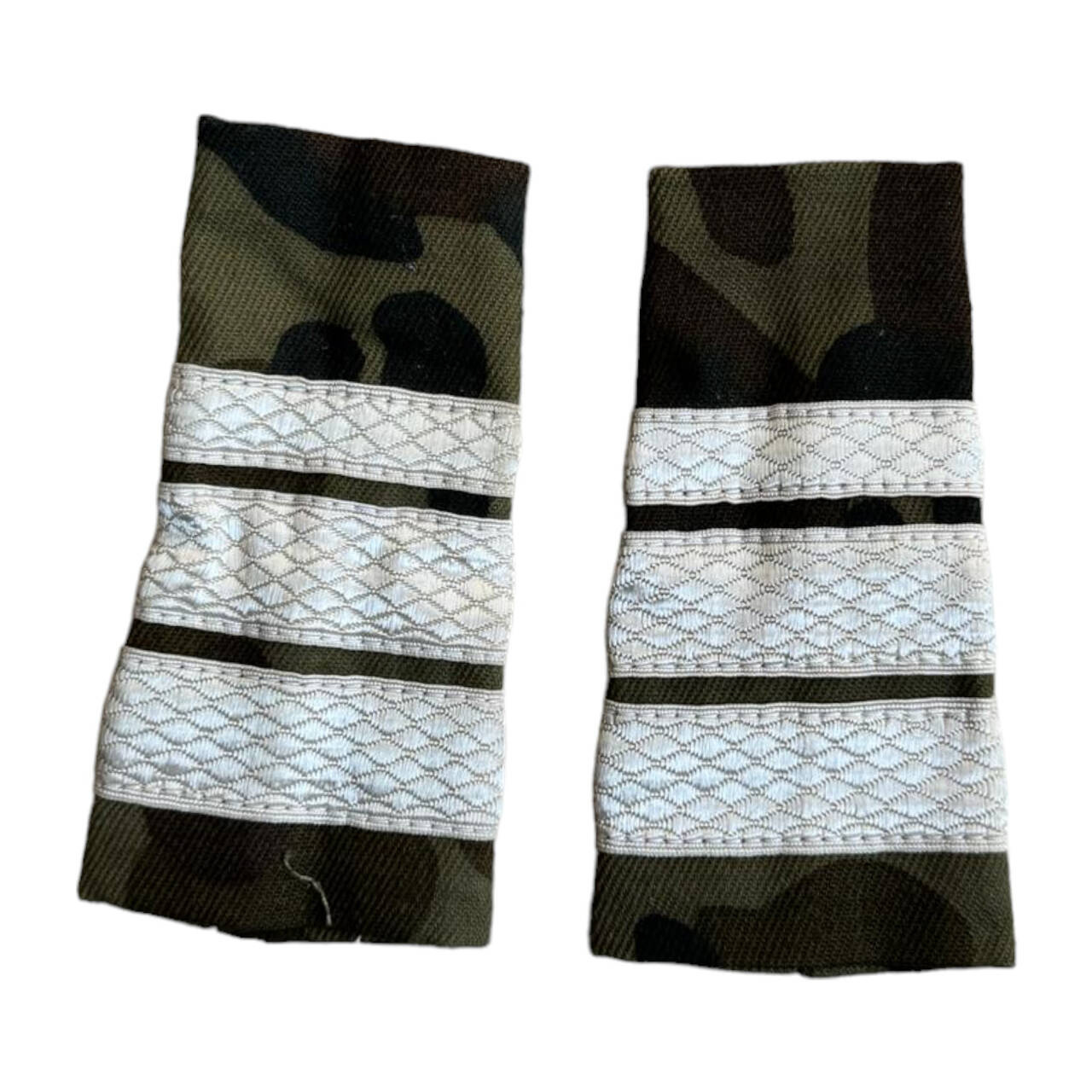 The military stripes are made in the form of a tubular sleeve with uneven ends, made on textile fabric, and embroidered with gold/silver/black thread.