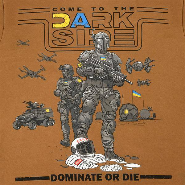 The main part of the print on the chest reads "Go to the dark side" and below it "Dominate or perish" with an original image of Ukrainian cosmonauts with rifles standing on the corpses of Soviet enemies. The sleeves feature the beautiful "M-Tac UA" logo on one side and the Ukrainian coat of arms with the "Dark Side" warrior on the other. The T-shirt is best suited for active recreation and sports, so it will work well for hunters, fishermen, hikers and lovers of various sports. Thin elastic and high-quality knitted fabric impressively emphasize the assets of the figure and give a feeling of complete comfort.
