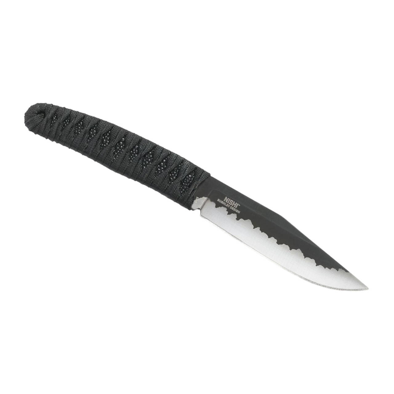 The CRKT Nishi, designed by Lucas Burnley, hardly hides its Japanese influences. The combination of the American blade shape and Japanese handle is unique and inspiring with a completely new aesthetic. The fixed-blade knife is equipped with a modern 8Cr13MoV blade, which has an acid-etched titanium nitride coating and thus exudes an almost historic charm. The wrapped handle is reinforced with epoxy resin and offers a pleasant grip with a lanyard and mounted GRP sheath.