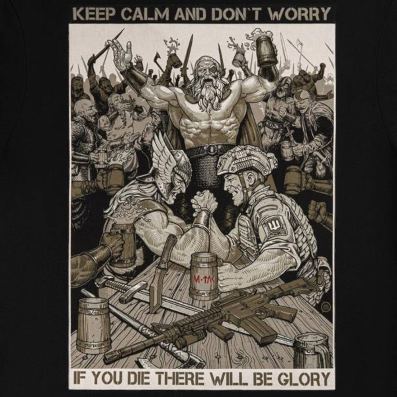 The print of the t-shirt depicts the plot in which the Ukrainian defender ends up in Valhalla. There with one of the ancient warriors, he met in an arm-wrestling duel, and Odin himself counts down the time until the start of the match for them. The inscriptions on the print "KEEP CALM AND DON'T WORRY" and "IF YOU DIE THERE WILL BE GLORY" symbolize the glory for every defender of the native land, even after death.
