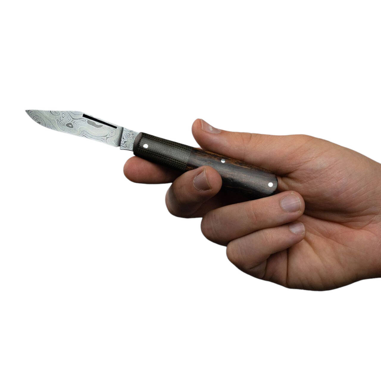 The integrally constructed pocket knife has a contoured handle body made of olive green Micarta Canvas, which is milled from solid and forms Barlow's signature bolts. The lightweight construction can thus dispense with extra metal linings altogether. This noble gentleman's knife is extremely comfortable to hold thanks to the equally contoured handle scales made from certified imported desert ironwood. With a high-quality felt pouch for storage, a certificate of authenticity, and an individual serial number. Handmade in the Boker knife factory in Solingen.