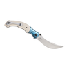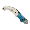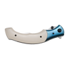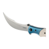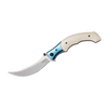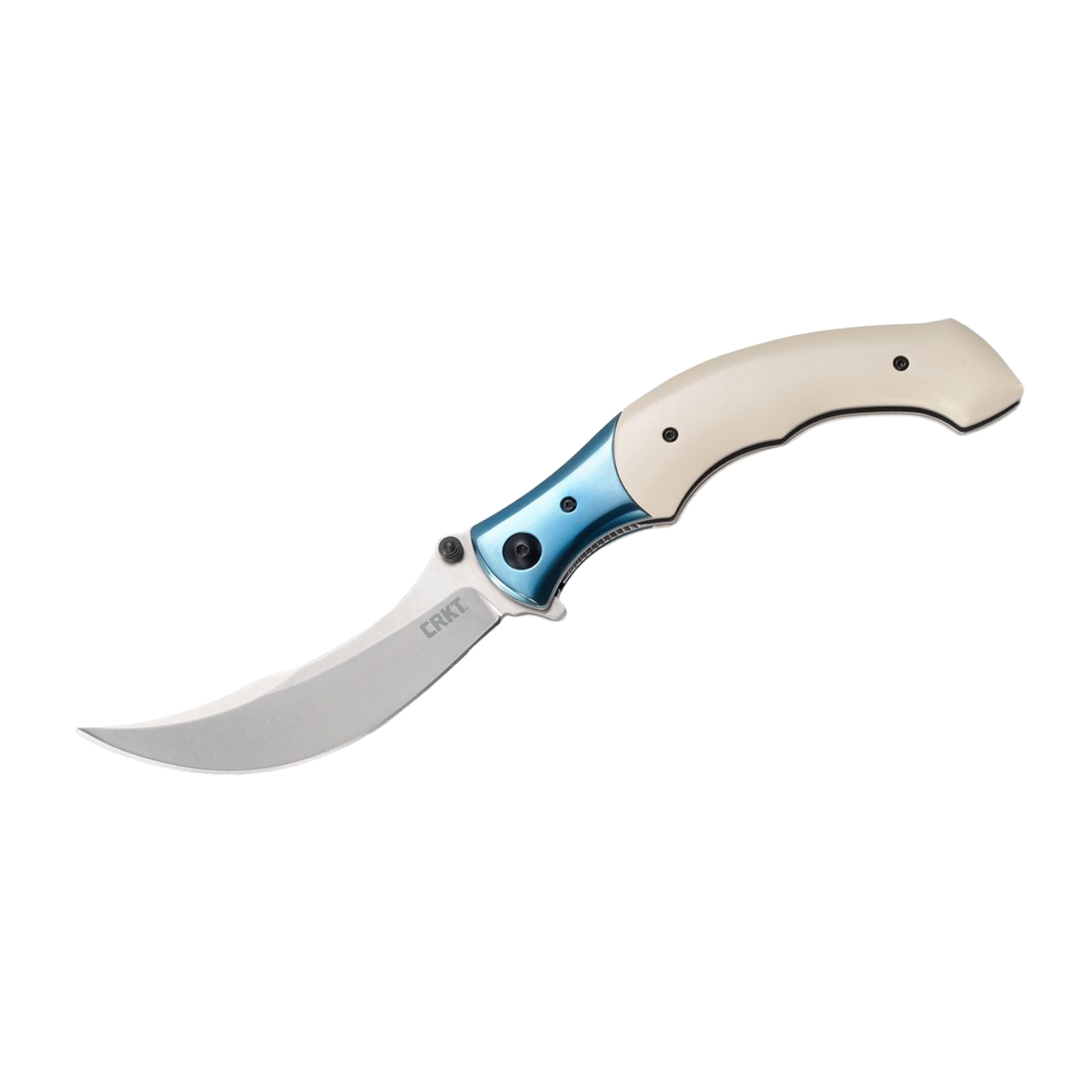 The CRKT Ritual takes up the curved forms of a Persian dagger and completely reinterprets this stately knife shape. Alan Folts provides the folder with the typical curved blade made of Sandvik 12C27, which opens spring-assisted either by flipper or thumb stud and is secured by the liner lock. The ergonomic handle ensures a good grip and is made of an exciting mix of materials with blue anodised stainless steel bolsters and ivory micarta scales. With a clip (tip-up/r).