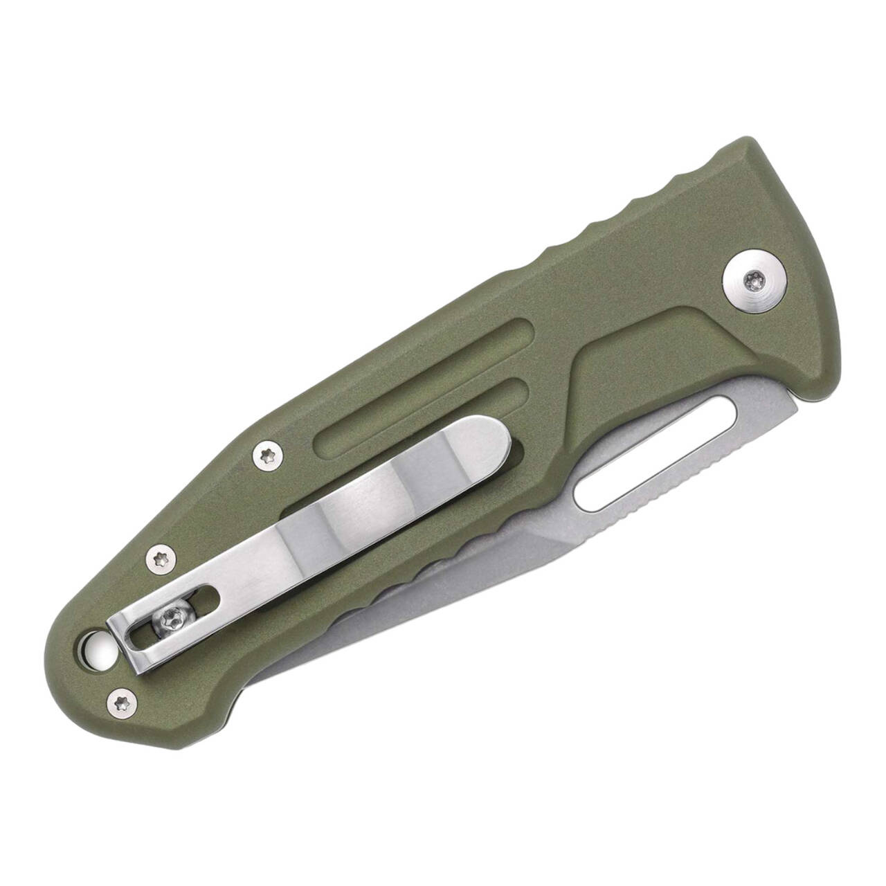 Sophisticated -Stefano di Lorenzi interprets the Fox New Smarty as a contemporary automatic knife with modern materials and attractive lines. Equipped with a spearpoint blade made of N690, the automatic knife tackles daily cutting tasks with confidence. To open the knife, press the push button. The tactical claim is underlined by the ricasso and the breakthrough on the blade, as well as the robust handle made of green anodised aluminium, which has distinctive textures for optimum grip. With tip-up (r) clip and lanyard loop.
