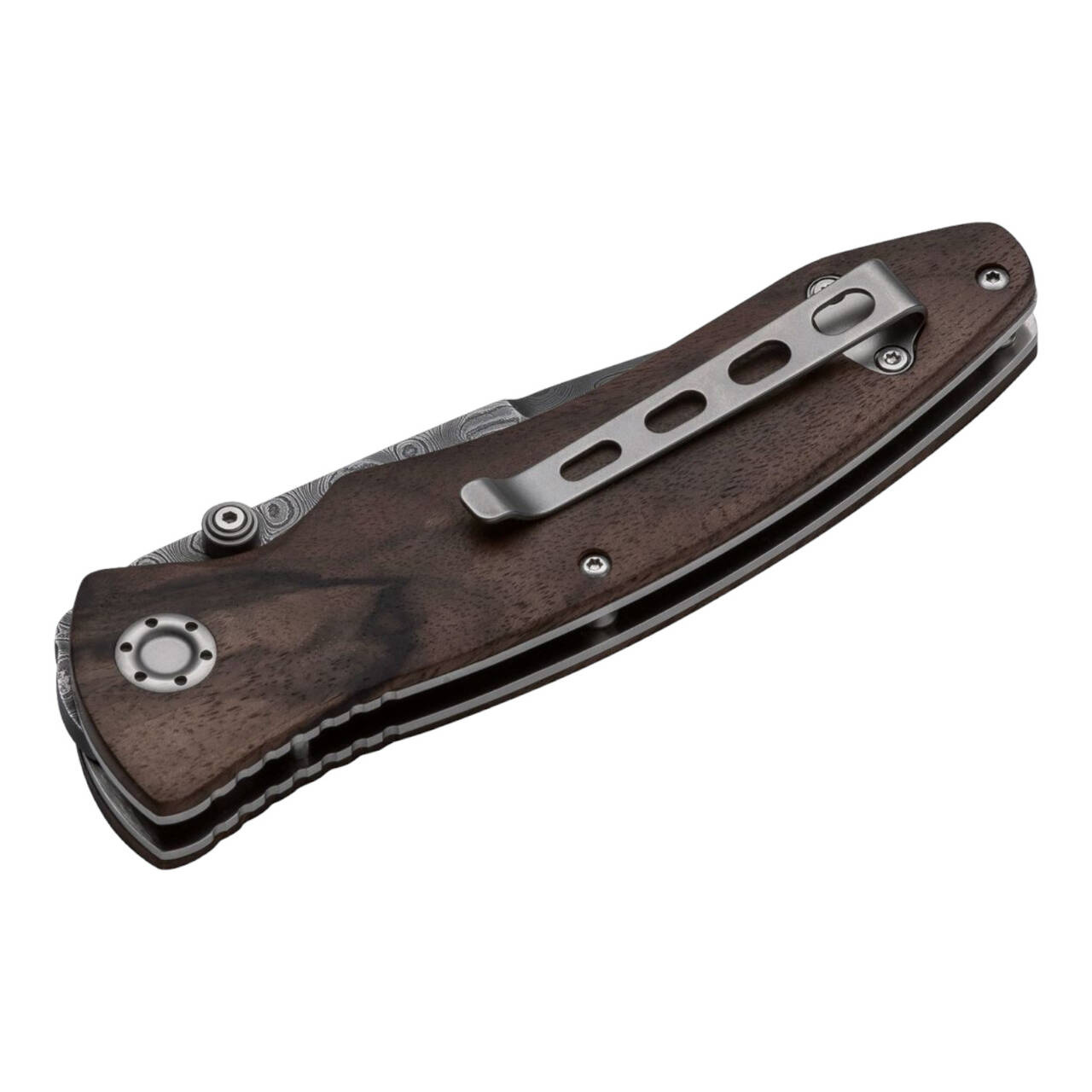 For years, many of our customers have been interested in our extraordinary collectible knife Boker Tirpitz-Damascus. Its popularity convinced us to develop another model featuring the historic Damascus steel. The Boker Tirpitz-Damascus Wood is approx. 10 mm thick with a much flatter construction. Its much more elegant lines are enhanced by the full-length scales of domestic walnut. The matte wood of the contoured handle scales is CNC-milled in a three-dimensional design. The coat of arms and name of the Tirpitz takes pride of place on the front.
