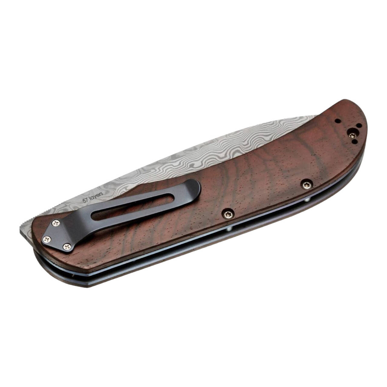 Hardly any other Boker Plus pocket knife has been so in demand in recent years and appeared in so many variations as the Exskelibur by Mike Skellern. The knifemaker from South Africa has created one of the most successful and popular series in the Boker Plus range with his design. This version features blue anodized titanium liners and clip and a stainless Damascus blade with 58 - 60 HRC for ensure unrivaled elegance. The knife is locked by a classic linerlock. The cocobol wood handle scales have a strong grain and underline the noble character of the gentleman folder. The lively wood gives the Exskelibur a more rugged charm. With high-quality nylon case for storage.