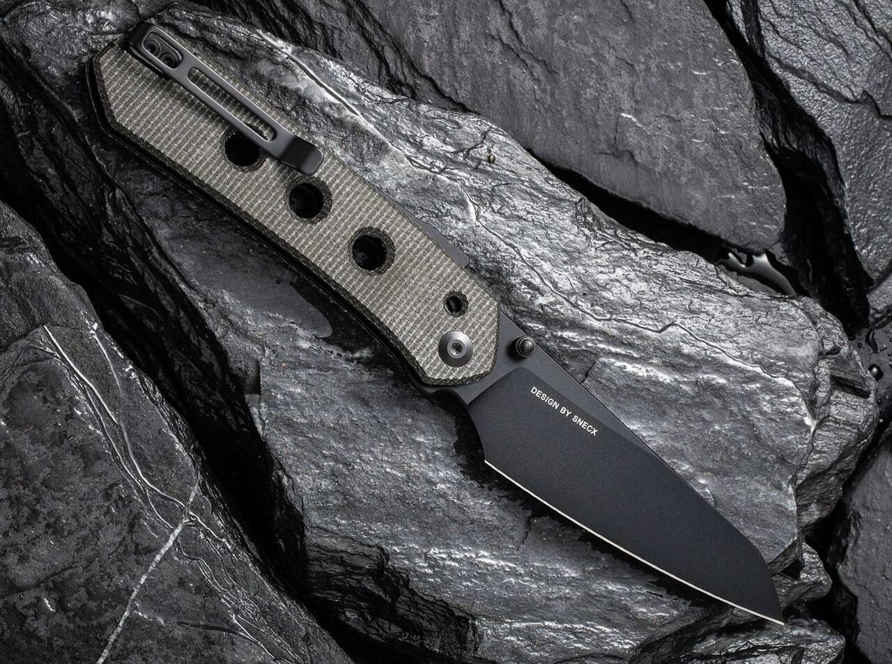 The Vision FG was born out of a visionary idea by CIVIVI and Snecx Tan, which has now become a steel reality. The avant-garde EDC knife is equipped with a black, ball-bearing reverse Tanto blade made of Nitro-V that has outstanding cutting capabilities. In addition to the weight-reducing holes in the green Micarta handle, the thumb stud on both sides harmoniously continues the appearance of the futuristic knife. The blade is secured by the Superlock mechanism, which unlocks the knife again when the lever on the back of the blade is pulled back. With tip-up clip (r).