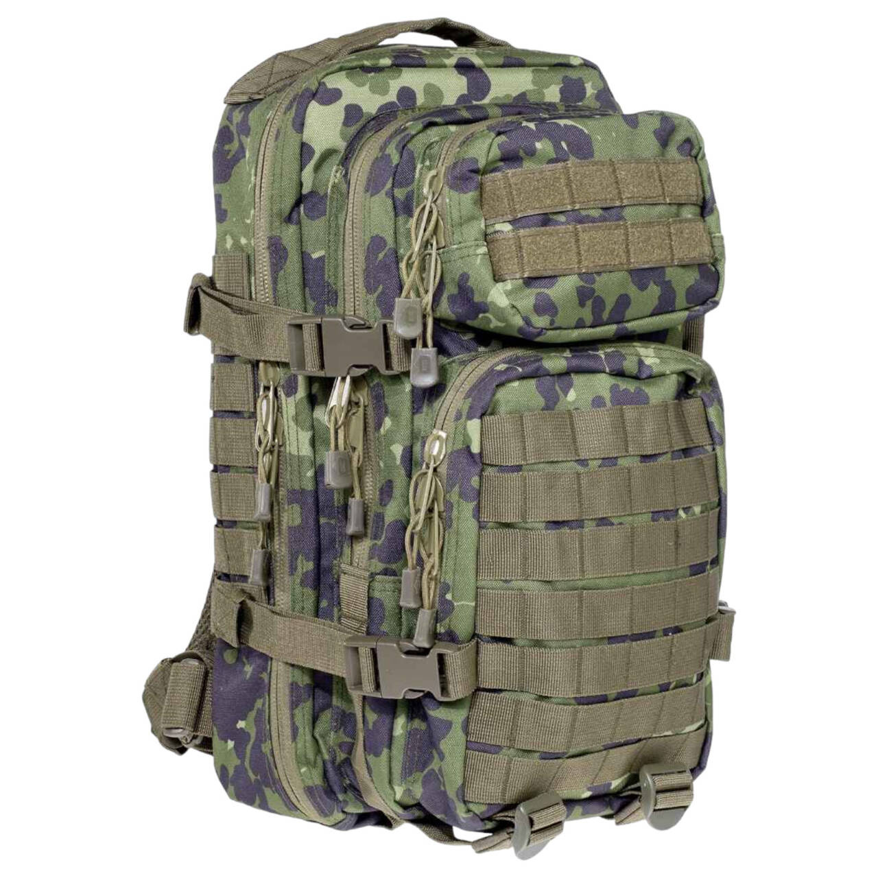 Backpack with 2 large main compartments and 2 front compartments each with zipper, velcro pocket on back for hydration system. Carry handle, padded back and shoulder straps with D-rings, Molle attachment points, Velcro surface on front compartment.