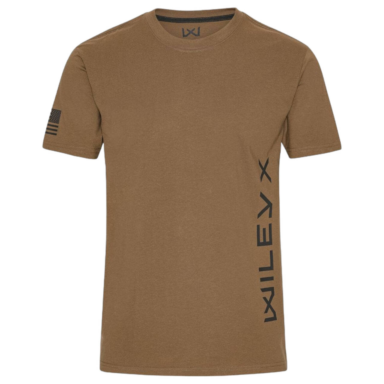 The T-shirt is made from 60% cotton and 40% polyester, which gives you a nice, soft quality with maximized comfort. It's designed with a large, vertical, contrasting Wiley X logo on the left front left side of the t-shirt and a WX flag label at the hem of the t-shirt. On the right sleeve, the design features a print of a U.S. Assault Flag, which means the stars of the flag are pointing forward, illustrating the movement of the flag, as seen on American uniforms.