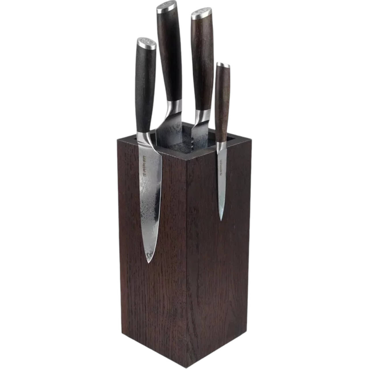 The square block of solid smoked oak wood, equipped with knives, features an integrated insert with fine plastic bristles. Each side is fitted with magnets. The set includes a paring knife, a small chef's knife, a bread knife, and a chef's knife, all easily accessible at any time. Purchasing the set offers a 10% price advantage compared to buying each knife individually.