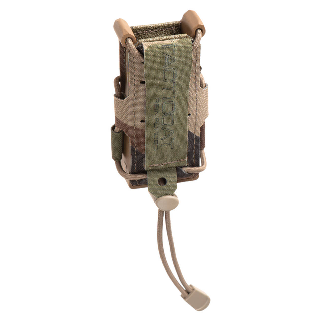 The Clawgear Speedpouch is a hybrid construction that utilizes a plastic retention frame to tightly hold a single pistol magazine without the need for a classic bungee retention pull tab, giving the user a quick magazine draw. Magazine retention is quick and easy to adjust. External MOLLE laser MOLLE laser cut-outs allow for stacking of bags.