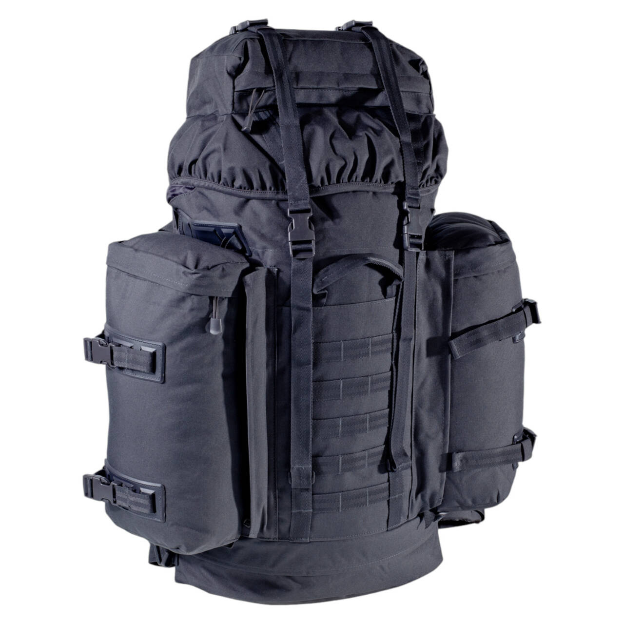 BW mountain backpack with detachable side pockets. Comfortable and height-adjustable carrying system with integrated aluminum frame for stabilization. Large 80 liter main compartment accessible from the top and through the sleeping bag compartment. The two side pockets, each with 10 liters, can be used individually or zipped together as a day pack. In addition to the lid compartment, the BW Mountain also has MOLLE straps and loops for attaching extra gear. Adjustable padded shoulder straps and dirty laundry compartment at the bottom.