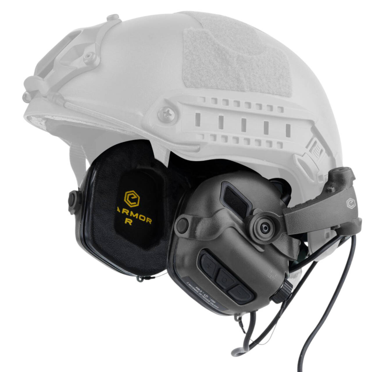 Earmor M31X Mark 3 active hearing protectors for headphones. They protect against dangerous noises while allowing you to hear ambient sounds. These sounds are detected by two directional microphones mounted on the outside of each earcup. They are later reproduced by speakers inside the headphones. They are IP67 waterproof, meaning they can withstand harsh weather conditions.