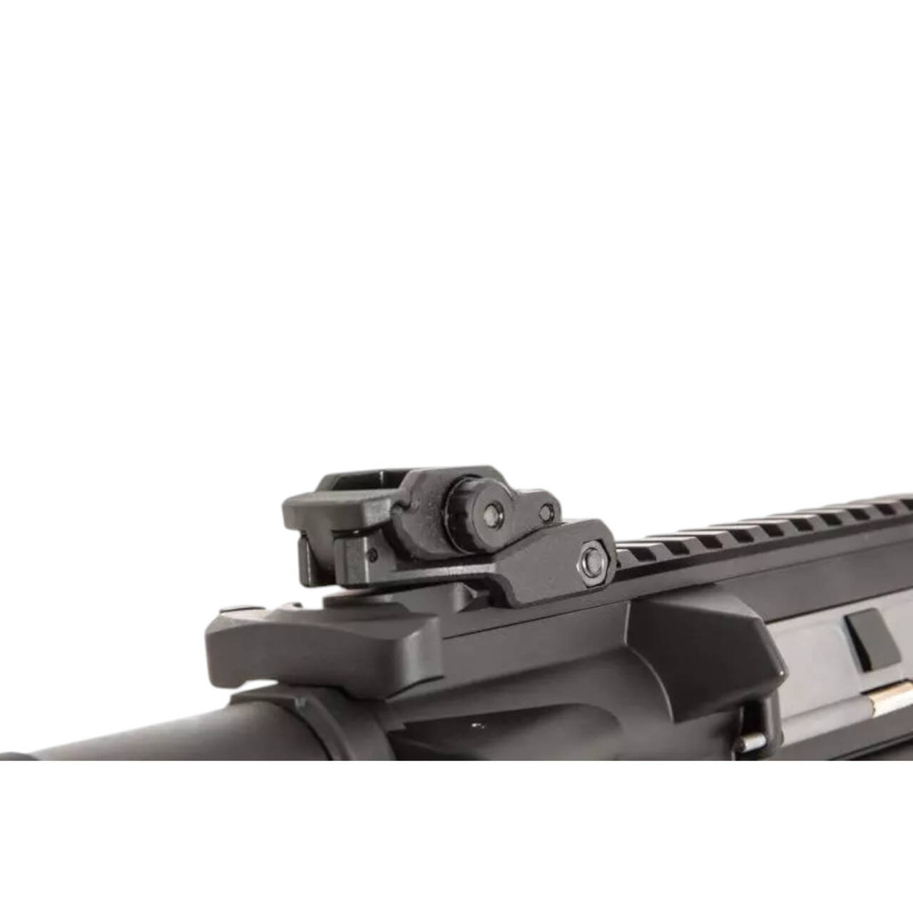 The rifle features a free-float front end with an M-LOK mounting system, which allows for the attachment of various tactical accessories such as flashlights, grips, laser pointers, or optical scopes. On the rear of the replica, there are also foldable iron sights.